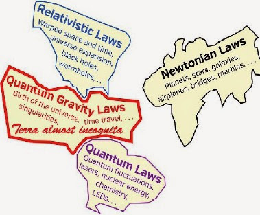 К 1957 году стало очевидно, что теория относительности и квантовая механика изначально несовместимы. Они предсказывают разные, несовместимые вещи в областях, где гравитация интенсивна и квантовые флуктуации сильны.[5] Эти области включают рождение Вселенной в Большом Взрыве (Глава 2), ядра черных дыр, таких как Гаргантюа (Главы 26 и 28), и путешествия назад во времени (Глава 30). В этих областях "огненный брак"[6] несовместимых законов теории относительности и квантовой механики дает начало новым законам квантовой гравитации (рисунок 3.2). Мы еще не знаем этих законов, но у нас есть кое-какие неотразимые идеи, в частности теория суперструн (Глава 21), благодаря огромным усилиям лучших мировых физиков двадцать первого века. Не считая этих идей, квантовая гравитация по-прежнему терра почти инкогнита (почти неизвестная земля). И здесь остается достаточно простора для захватывающей научной фантастики, простора, который Кристофер Нолан весьма искусно использует в Интерстелларе, см. Главы 28-30.
